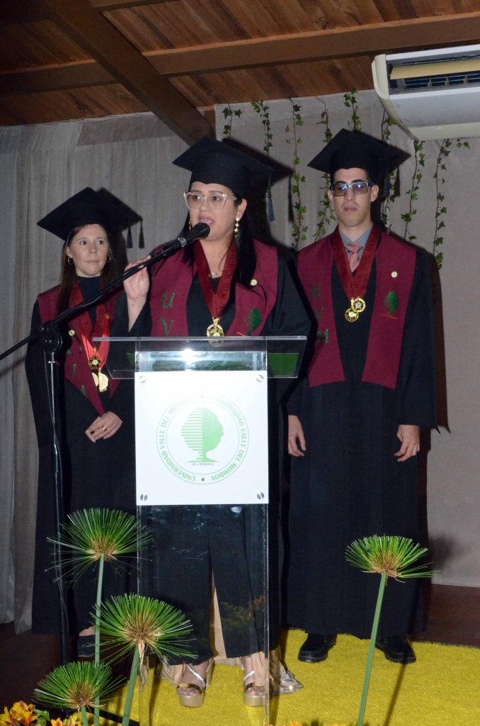 La profesora Walevska López, Vicerrectora Académica, ofreció un discurso centrado en los valores que distinguen al sello UVM. Durante su intervención, recordó a los graduandos que la formación recibida trasciende las aulas: «Hoy salen al mundo con más que un título; salen con una promesa implícita: la de ser personas en quienes los demás podamos creer», afirmó López, instando a los presentes a ejercer sus profesiones con integridad y ética.